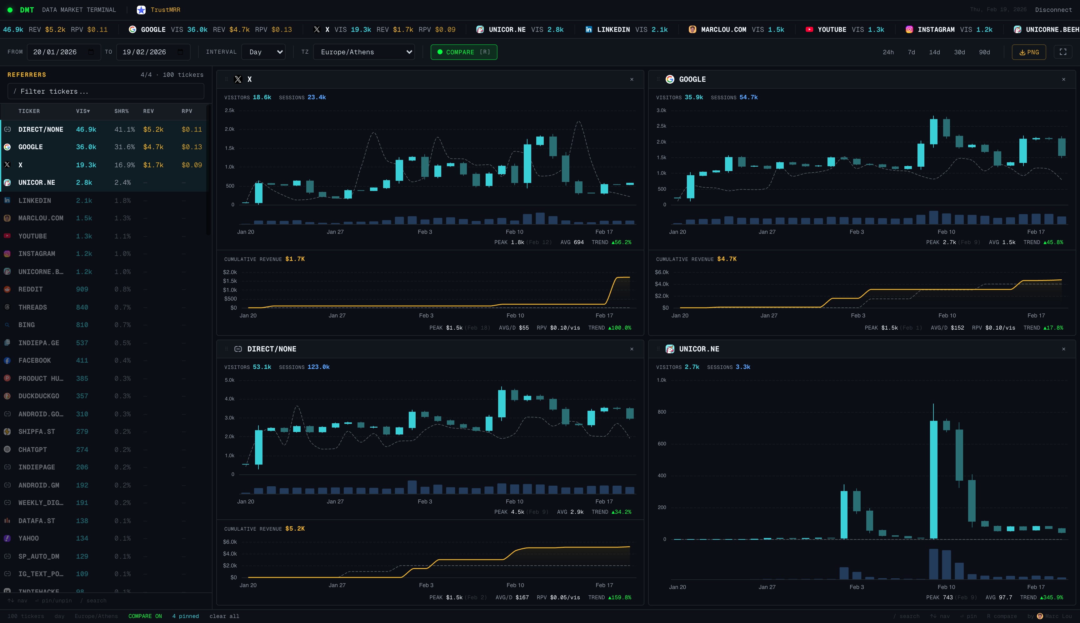 A Bloomberg terminal for web analytics. DataMarket gives you a dense, data-rich terminal interface to monitor your site like a Wall Street trader watches the markets.