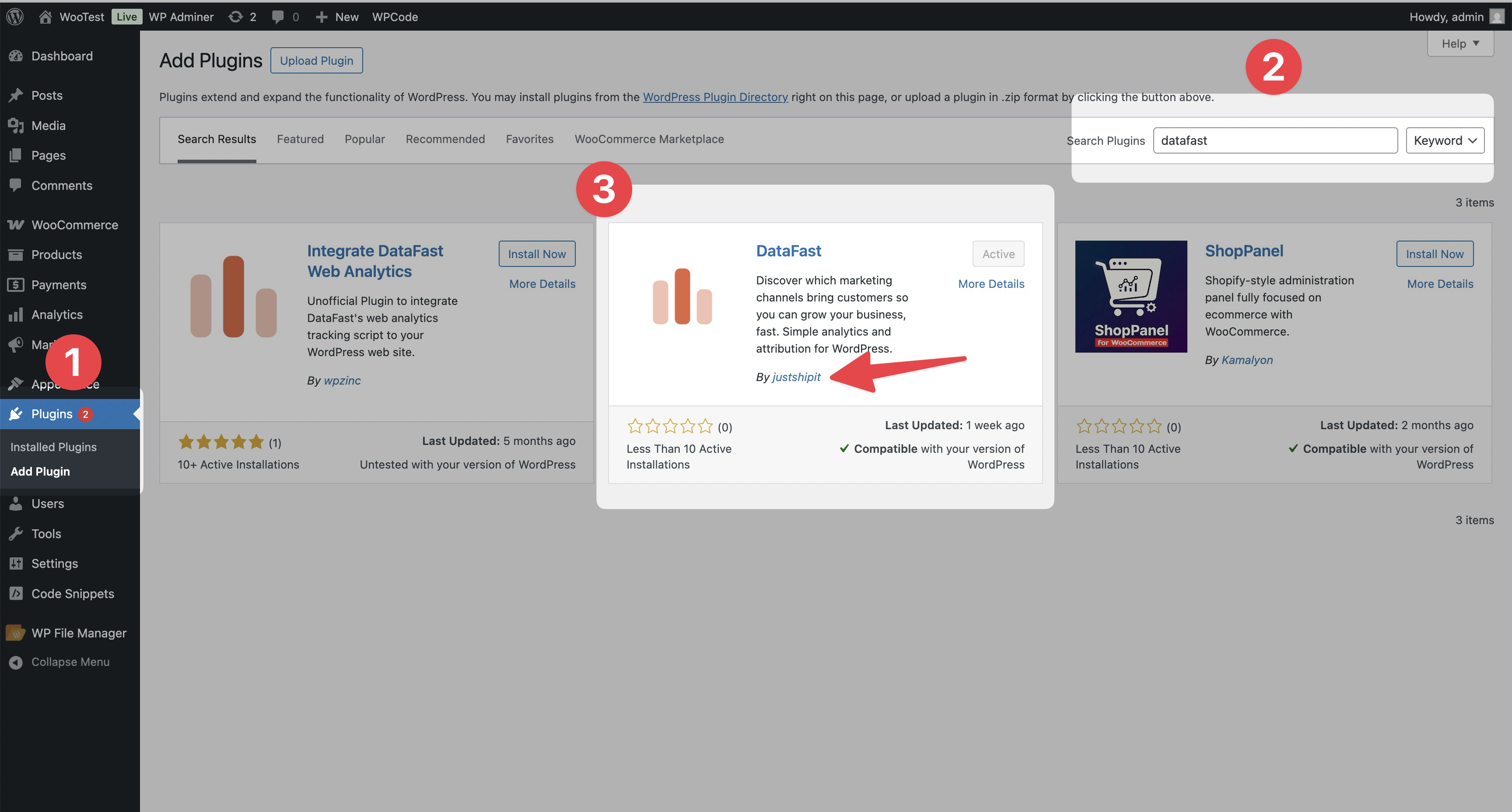 - Navigate to Plugins > Add, search for "DataFast" and install the plugin by contributor named "justshipit".